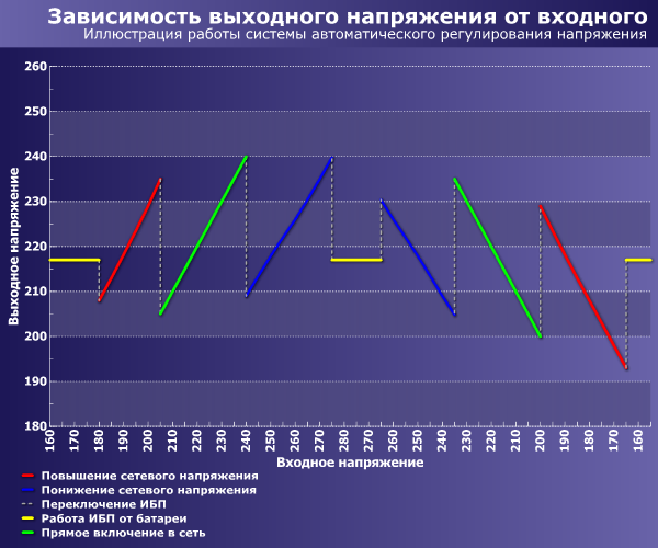 З вихідною напругою від електромережі за робочий час система автоматичного регулювання починає переходити на роботу від батарей. За допомогою звукового оповіщення УПС попереджає користувача про це. Звук в міру гучний.