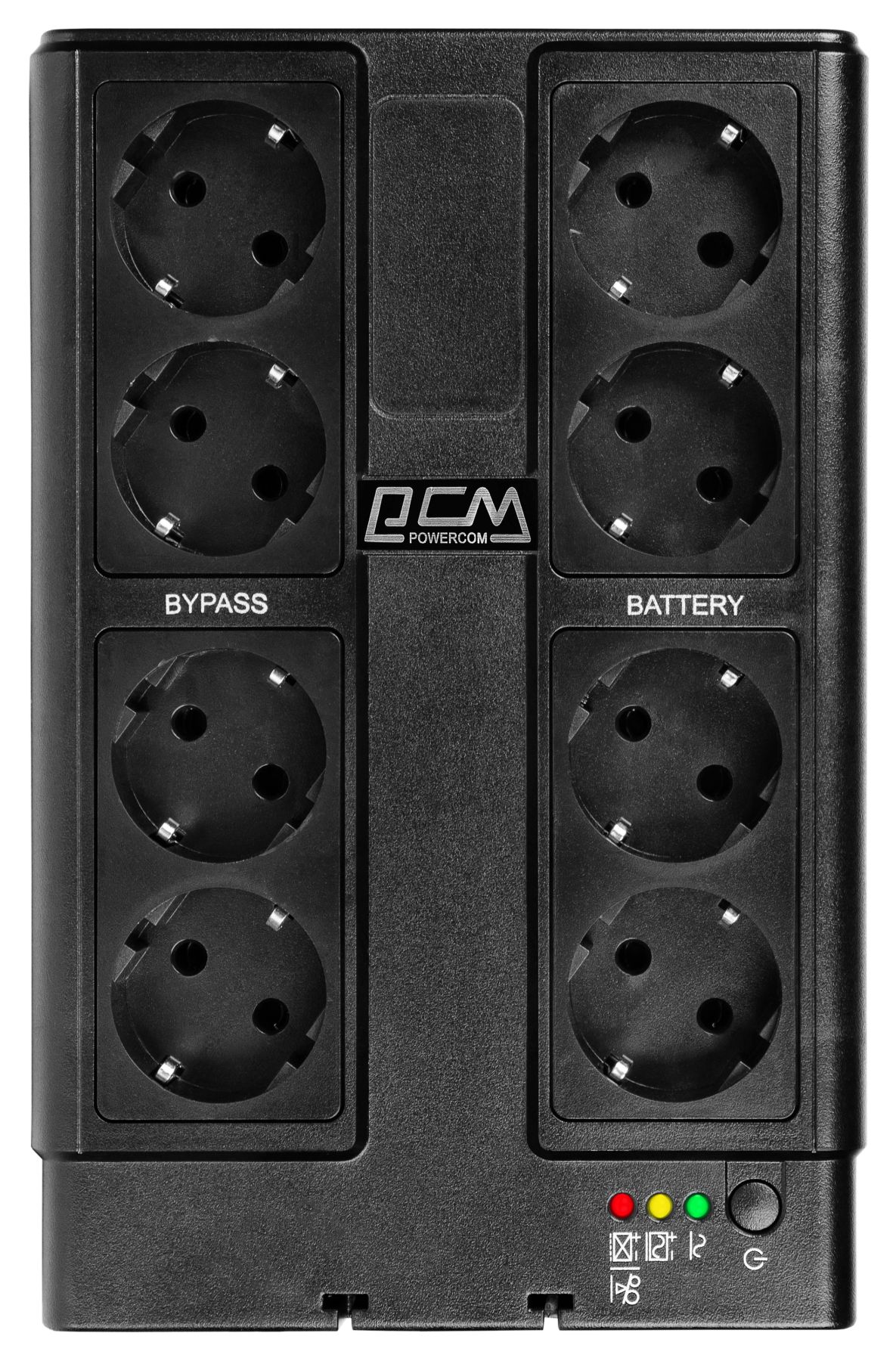 Off-line дбж резервний Powercom CUB-850N виконаний в підлогово-настільному форм-факторі з можливістю настінного розміщення. На верхній панелі розташовані: контактна група, кнопка ввімкнення та індикатори.