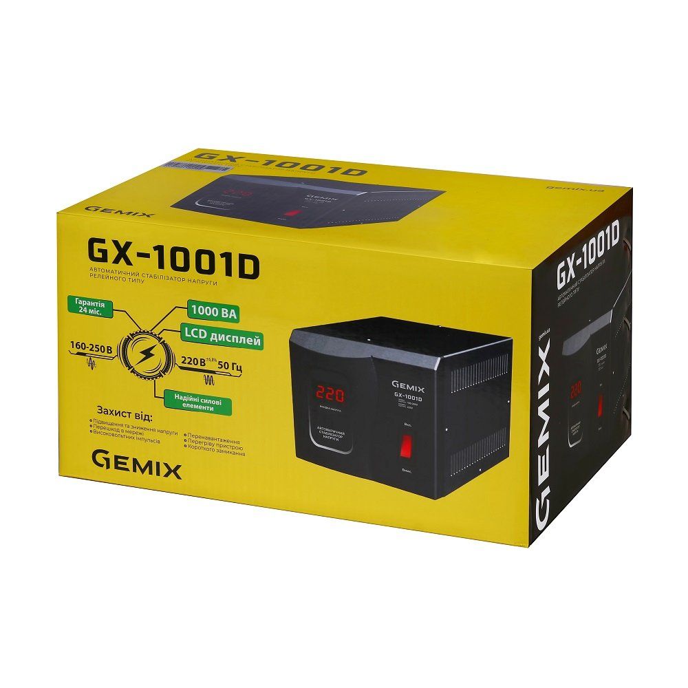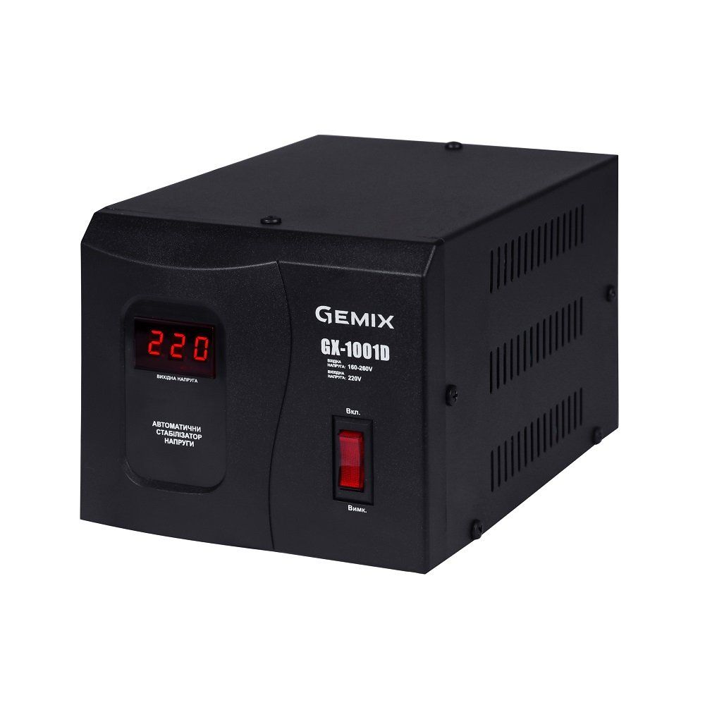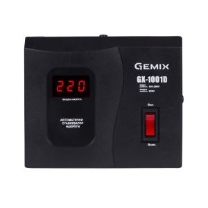 Автоматичний стабілізатор напруги Gemix GX-1001D - однофазний, релейного типу. Призначений для забезпечення стабільного електроживлення та захисту побутового обладнання (електронасосів, комп'ютерів, телевізорів тощо) від підвищеної, зниженої напруги і стрибків напруги в електромережі. Принцип дії полягає в автоматичному перемиканні секцій (обмоток) автотрансформатора за допомогою електромагнітних реле. Стабілізатор забезпечує вихідну напругу у вигляді чистої синусоїди, напруга на рівні 220 В з точністю ± 6,8%. Час передачі менше 0,5 сек. Захист від високої вихідної напруги спрацьовує при 250 В.